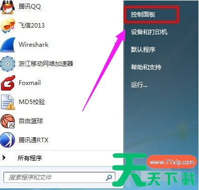 首先点击开始菜单,找到控制面板项,点击进入
