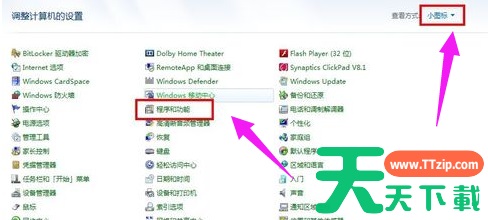 在控制面板中,选择小图标,这样可以显示全部内容,不然会显示不全找不到需要的功能,看到全部设置后,选择“程序和功能”。