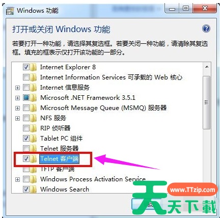 需要打开功能的前面打钩,把telnet客户端前的复选框勾上。