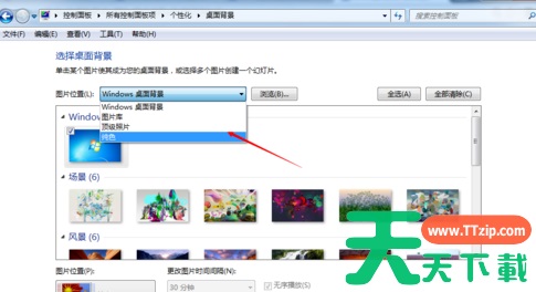 3:在桌面背景窗口里,点击图片位置下拉菜单,选择“纯色”选项。如下图所示。