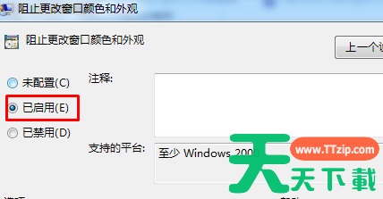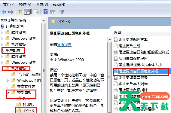 2、在系统策略编辑器窗口中,我们在左侧依次展开:“用户配置”-“管理模板”-“控制面板”-“个性化”,之后,我们在右键条目中找到:阻止更改窗口颜色和外观双击打开进行设置,设置为“已启用”;