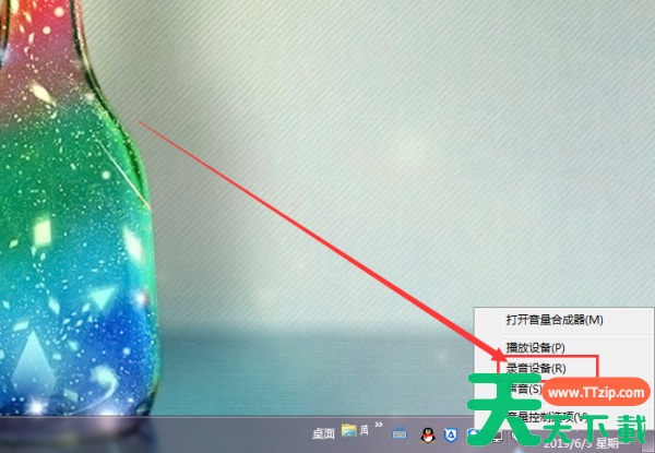 一、右键点击通知栏上的“喇叭”图标,菜单内点击“录音设备”。