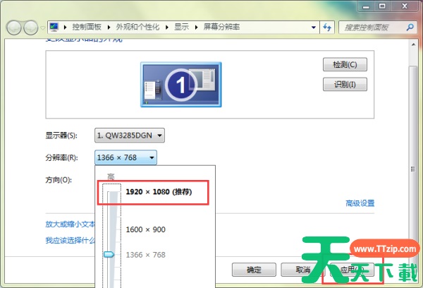 二、接着把桌面分辨率设置为“推荐分辨率”,点击“应用”。