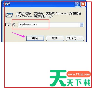 3、在电脑的运行框中,输入: explorer.exe 并且点击【确定】,可以打开资源管理器。