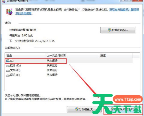 2.在磁盘碎片整理程序对话框里,选中c盘,点击磁盘碎片整理。