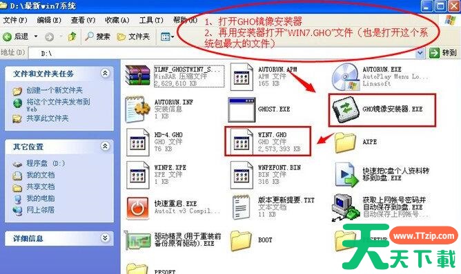 1.解压之后得到如下图的文件,打开Ghost文件后运行“GHO镜像安装器”再用安装器打开“WIN7.GHO”文件(也是打开这个系统包最大的文件)