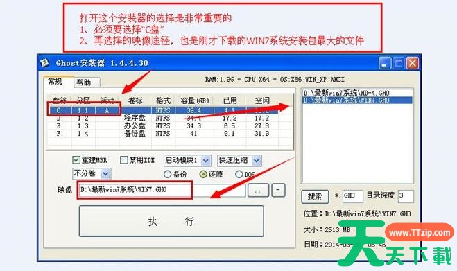 2.打开“GHO镜像安装器”如下图,里面的选择是非常重要的,必须要在盘符选择“C盘”,再选择映像途径,也是选择刚才下载解压的雨林木风win7旗舰版安装包最大的文件。一般就是默认就可以了。