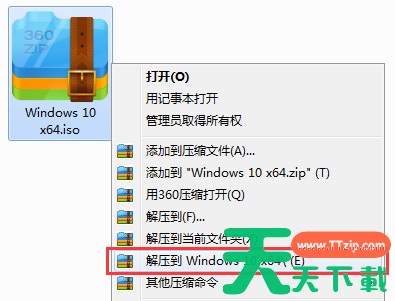 打开E盘,鼠标右击压缩包(Windows 10 X64.iso),选择“解压到Windows 10 X64”进行文件解压。