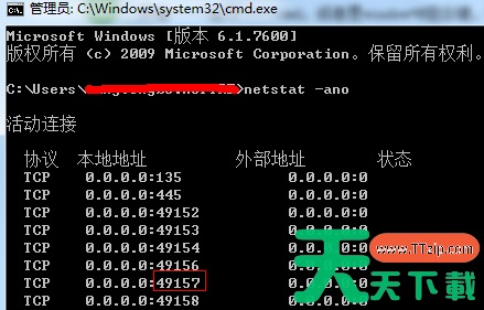 2、输入命令:netstat -ano,列出所有端口的情况。在列表中我们观察被占用的端口,比如是49157,首先找到它。