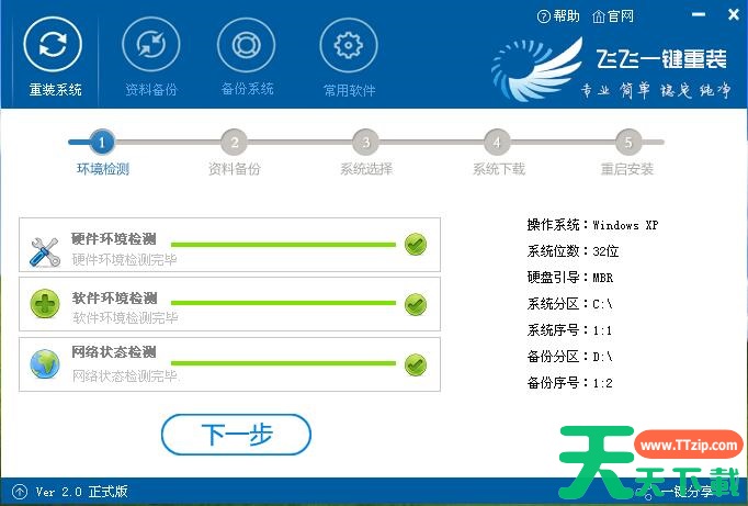 2、软件会自动检测电脑的安装环境,确定电脑是否支持重装,检测完成点击【下一步】。