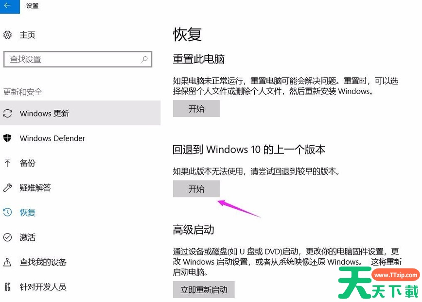 2.点击左侧【恢复】,在右侧展开的窗口中找到【回退到Windows10上一个版本】,点击【开始】
