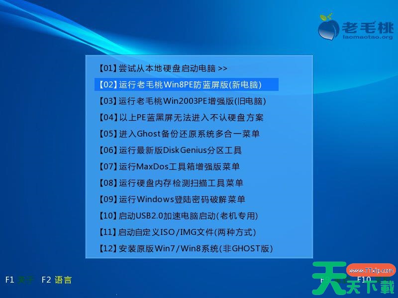 4.进入到老毛桃主菜单页面后,接着将光标移至“【02】运行老毛桃Win8PE防蓝屏版(新电脑)”,按回车键确认。