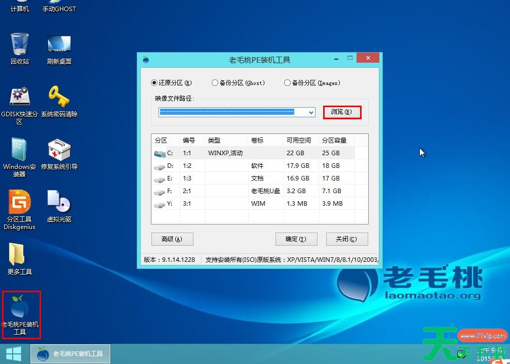 5.进入pe系统后,鼠标左键双击打开桌面上的老毛桃PE装机工具。打开工具主窗口后,点击映像文件路径后面的【浏览】按钮。