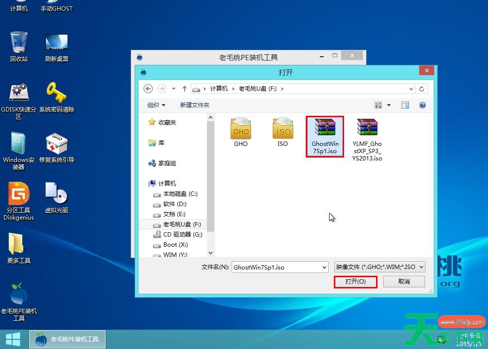 6.接着找到并选中u盘启动盘中的win7系统iso镜像文件,点击【打开】即可。