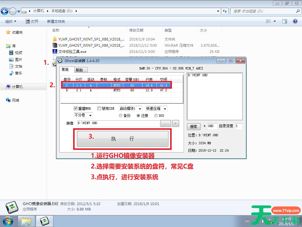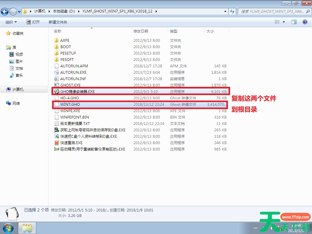 1.下载好系统后,把【WIN7.GHO】和【GHO镜像安装器(安装系统或硬盘安装)】两个文件剪切到磁盘根目录下,这里选择放在D盘里;