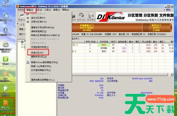 4.进入光盘PE之后,如果需要重新分区,双击桌面上【分区工具DiskGenius】,然后点击【硬盘】—【快速分区】。