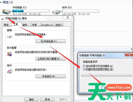 2、之后选择【工具】选项,点击【开始检查】按钮,之后弹出检查磁盘选项,将下述两种选项勾选上,然后点击【开始】按钮,这时程序就开始修复SD卡了,修复成功后会提醒。