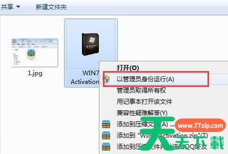 1、进入刚刚解压的Win7 activation 文件夹,里面会有一个Win7activation.exe的文件,对着这个文件点击鼠标右键,选择“以管理员身份运行”。