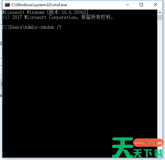 1、win+R键打开运行,输入cmd,在出现的界面输入“chkdsk /?”,下图所示: