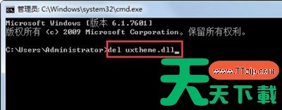 7、在任务管理器的进程中结束explore.exe进程,关闭任务管理器,接着在命令对话框中输入del uxtheme.dll回车,再输入ren uxtheme.dll.bak uxtheme.dll 回车,完成后重启计算机即可。