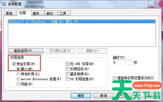 3、从打开的“系统配置”界面中,切换到“引导”选项卡,勾选“安全引导”和“最小化”两个项目,点击“确定”按钮。如图所示: