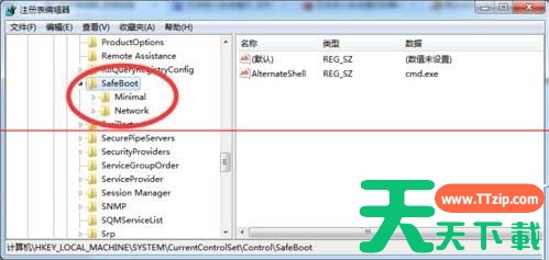 2、从打开的“注册表编辑器”界面中,依次进入“HKEY_LOCAL_MACHINESYSTEMCurrentControlSetControlSafeBoot”,在此可以看到“Minimal”及 “Network”项。如图所示: