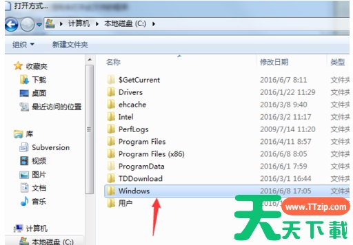 3、在浏览中,打开c盘,选择windows文件夹。