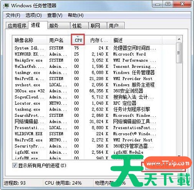 2、在点击进程窗口中的cpu选项,cpu占用率最高的程序就是需要关闭的进程了,选中它,再点击下面的结束进程就可以了。