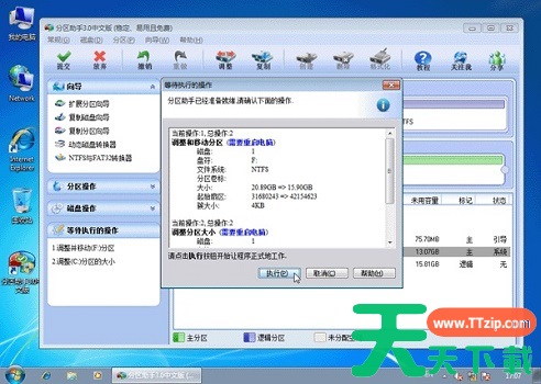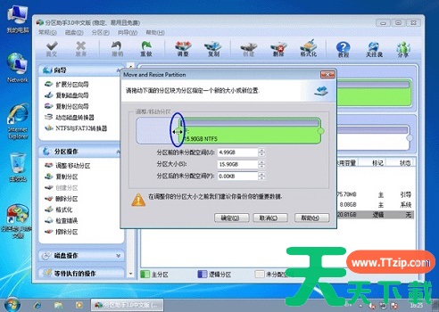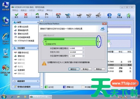 4、确定之后,我们再用相同方法打开c盘的“调整/移动分区”,然后如图所示,将右边的按钮往右拉,再点击确定。