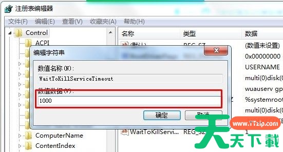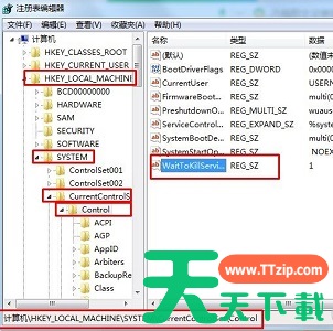 2、来到如下路径“HKEY_LOCAL_MACHINE/SYSTEM/CurrentControlSet/Control”双击打开“WaitToKillServiceTimeOut”如图所示。
