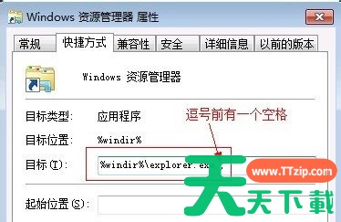 7、将目标更改为“%windir%explorer.exe ,”如图所示。