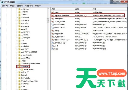 2、进入“HKEY_LOCAL_MACHINESYSTEMCurrentControlSetServicesAudiosrv”这个路径,找到右侧的“DependOnService”