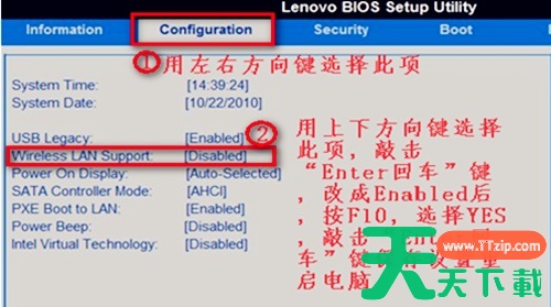 4、重启电脑,使用热键进入bios设置,在“configuration”中将无线网络更改会“Enabled”