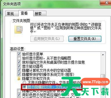 3、在查看选项卡的高级设置下找到”隐藏文件和文件夹“,勾选”显示隐藏的文件、文件夹和驱动器“即可。