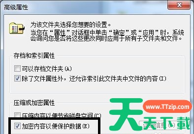 3、在文件夹高级属性中勾选“加密内容以便保护数据”,再点击”确定“