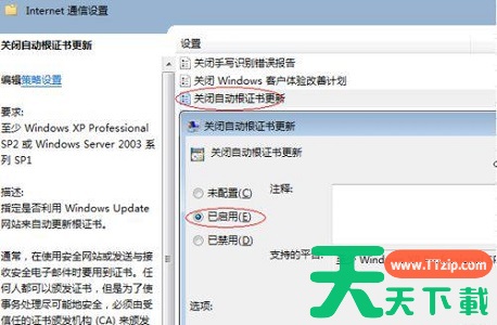 3、双击打开“关闭自动根证书更新”,勾选“已启用”