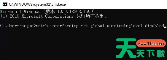 5、在弹出界面中输入“netsh interfacetcp set global autotuninglevel=disabled”回车确定即可。
