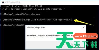 3、接着输入“slmgr /ipk”后面加新的产品密钥,输入完成后回车确定即可。