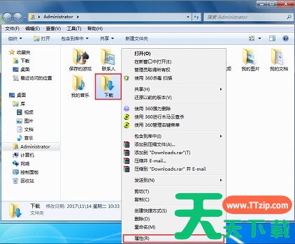 2、接着在其中找到“下载”文件夹,右键选中之后在下拉菜单找到“属性”