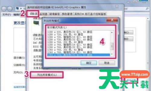 3、在“适配器”选项卡下选择“列出所有模式”就能看到我们支持哪些分辨率了。