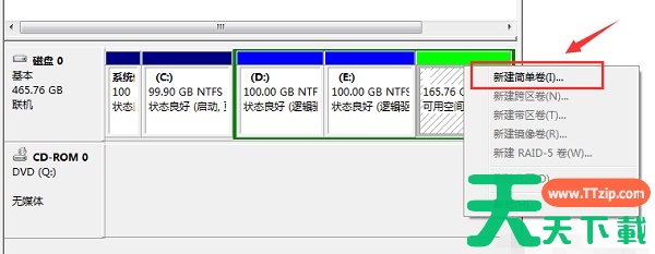 5、压缩完成之后,就会出现一个空的可用空间,右键选择“新建简单卷”
