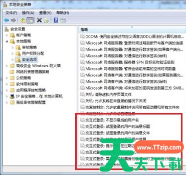 3、点击“安全选项”,然后我们就可以在右侧找到很多交互式登录文件,双击打开想要更改的方式就可以进行更改了。