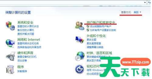3、在“类别”查看方式中找到“用户账户和家庭安全”