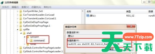 4、然后找到“cplfileshellcplopencommand”的路径,双击打开右边的文件,将“rundll32”前面的内容全部删除,点击“确定”