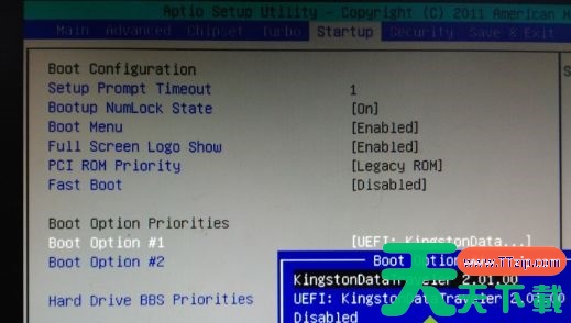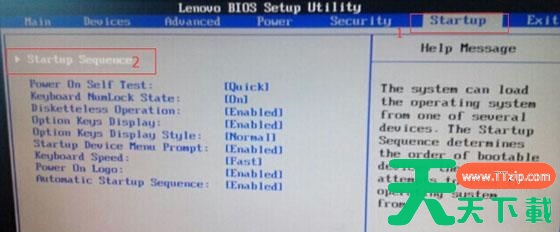 2、使用“→”方向键进入“Startup”然后进入图示选项。