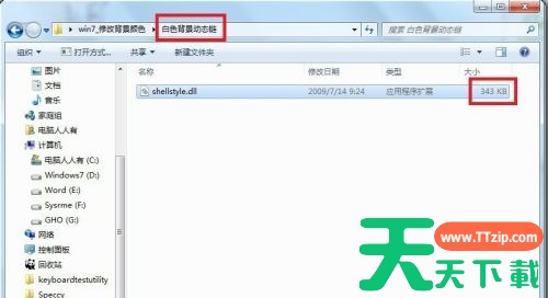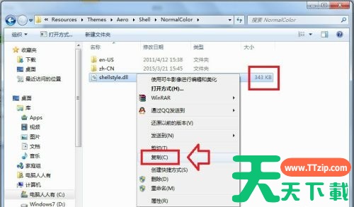 2、然后进入以下路径“C:WindowsResourcesThemesAeroShellNormalColor”,找到“shellstyle.dll”文件,复制他,然后关注一下它的大小。