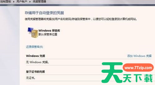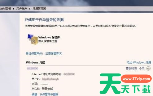 6、当添加好Windows凭据后,可以看到所添加的凭据信息,这样在计算机重启或注销后,登录远程打印机,就不用输入网络密码了,如下图所示。