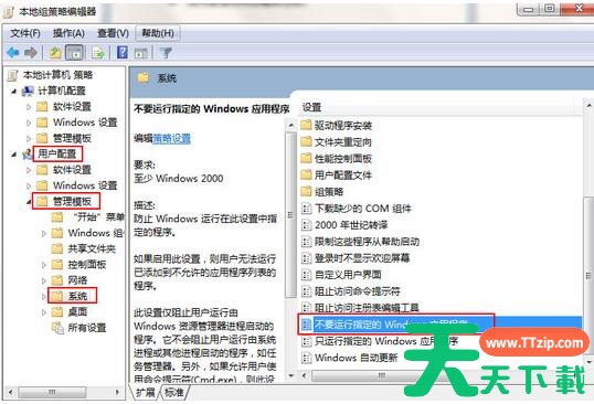2、进入“本地组策略编辑器”窗口中,在左侧窗口,按序打开:“用户配置-管理模板-系统”,在右侧窗口找到并双击打开“不要运行指定的Windows应用程序”。