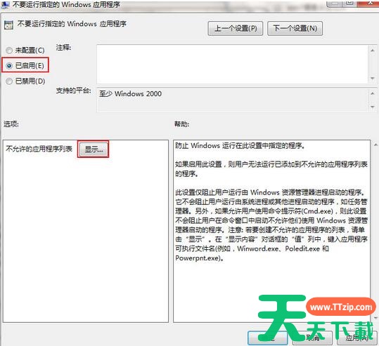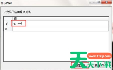 4、最后可以在“显示”窗口中的不允许的应用程序列表中,双击点击值下面的框,输入需要禁止应用程序全名,点击确定。