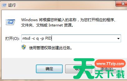 第一:我们直接点击“开始菜单”选择程序中的运行命令选项,然后直接写入命令:ntsd -c q -p PID(把最后那个PID,写成我们需要结束的进程名称)。